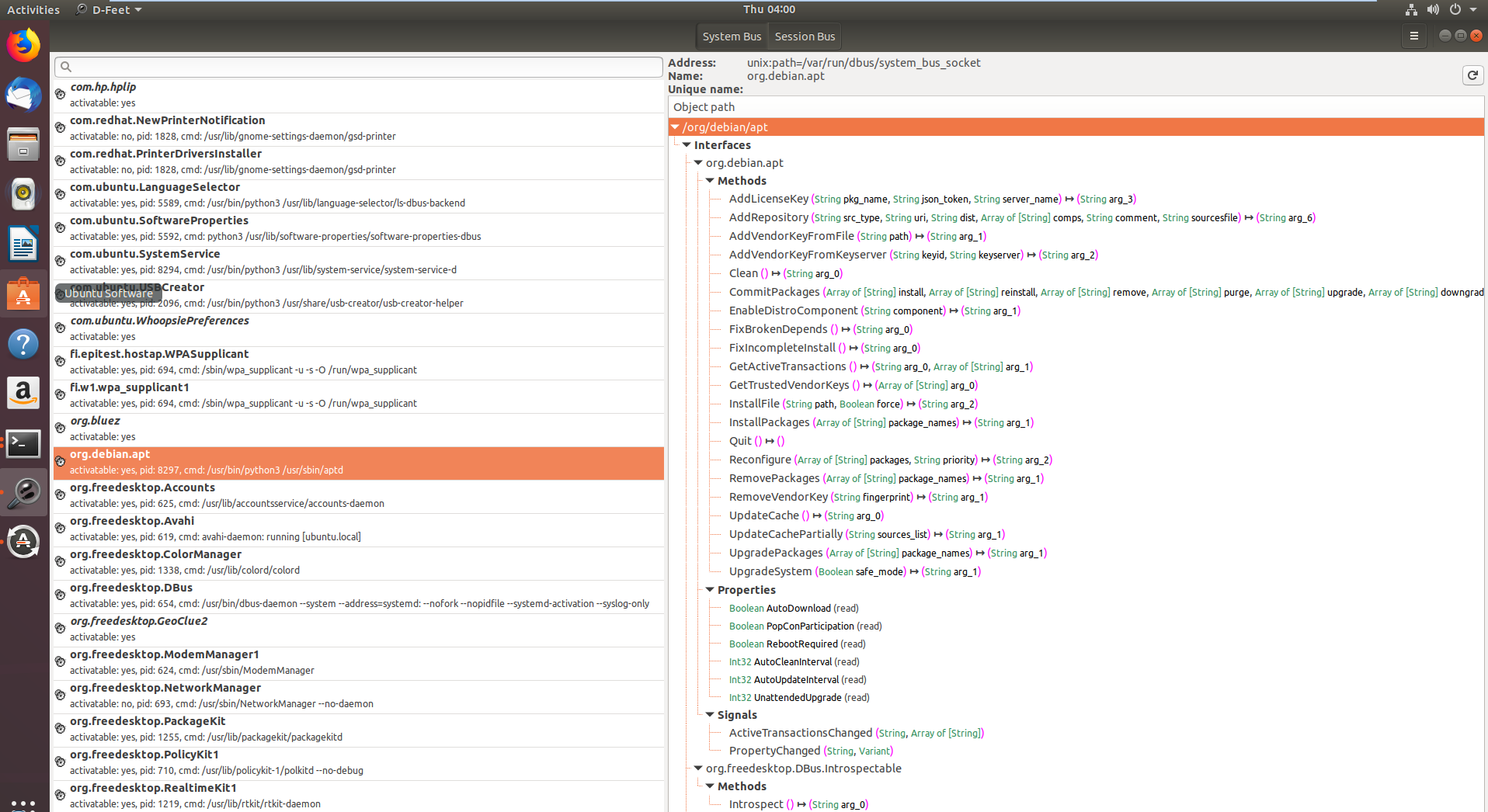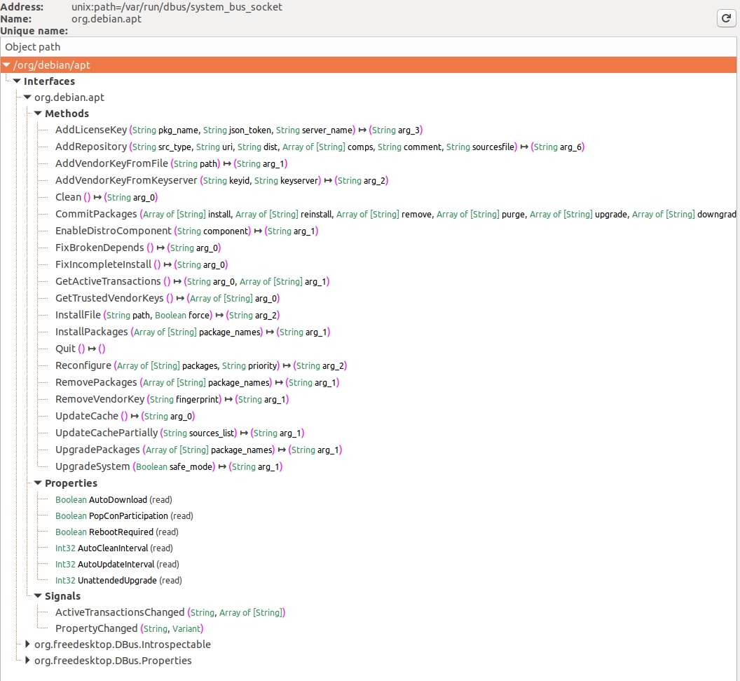 D-Feet is an excellent tool that proved essential during my research. On the left pane in Figure 1 you can see all the various services that have registered with the D-Bus daemon system bus (note the select System Bus button on the top). I selected the org.debin.apt service, and D-Feet automatically queried the service for all the available objects. Once I selected a specific object, the set of all interfaces, with their respective methods properties and signals are listed, as seen in Figure 2. Note that we also get the signature of each IPC exposed method.