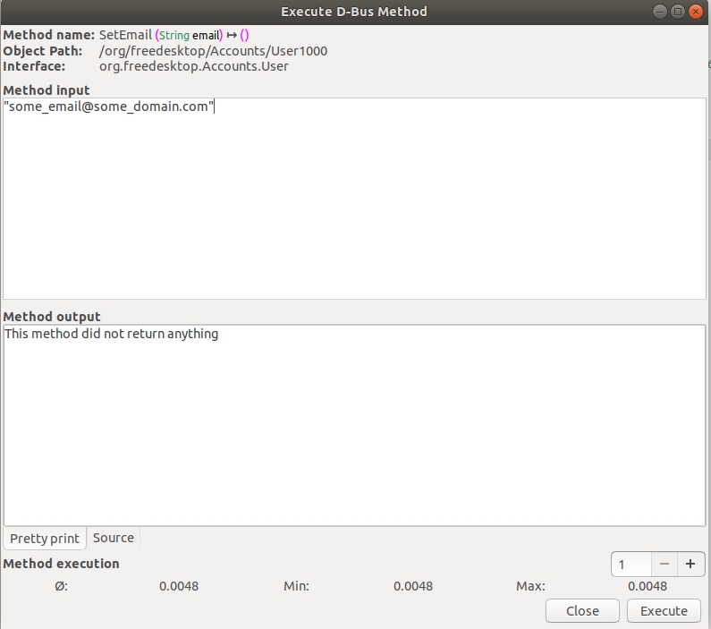 I used two tools to communicate with the D-Bus interface: CLI tool named gdbus, which allows to easily call D-Bus exposed methods in scripts, and D-Feet, a Python based GUI tool that helps to enumerate the available services on each bus and to see which objects each service contains.