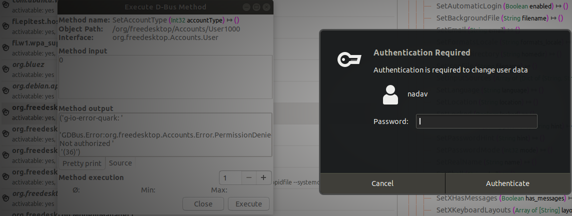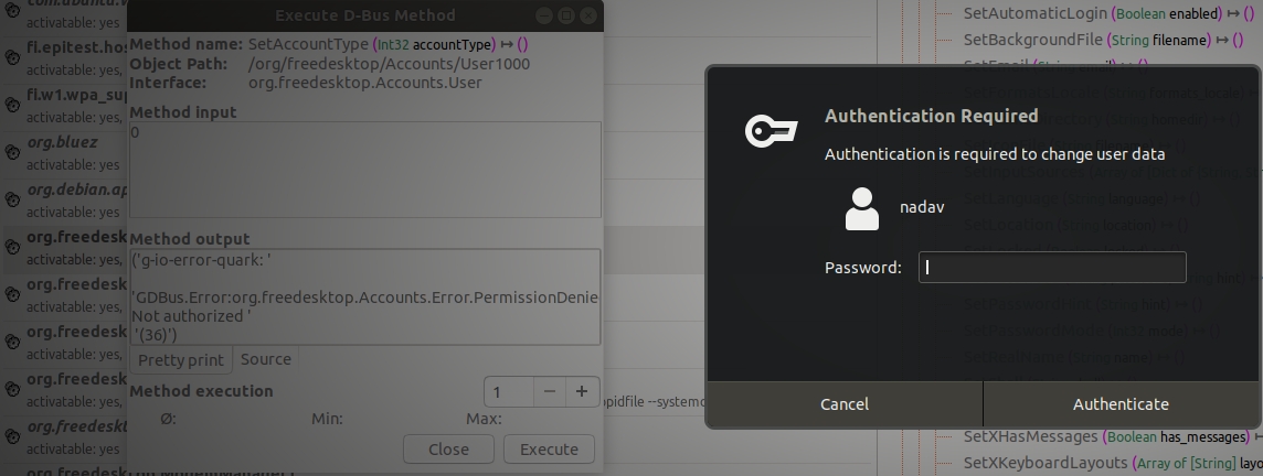 Also note that some of the services query another D-Bus service named org.freedeskto.PolicyKit1 whether a user should be allowed to perform certain actions or not. We will come back to this later in this blog post.