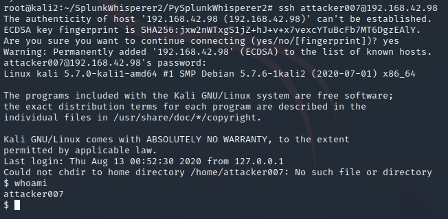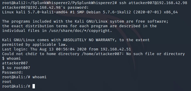 10- Confirming SSH access using attacker007, and then escalating to root using root007