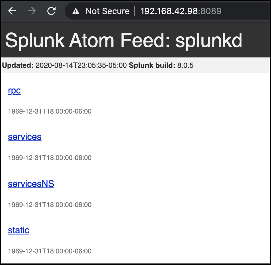 Universal Forwarder is accessible on each host at https://host:8089. Accessing any of the protected API calls, such as /service/ pops up a Basic authentication box. The username is always admin, and the password default used to be changeme until 2016 when Splunk required any new installations to set a password of 8 characters or higher. As you will note in my demo, complexity is not a requirement as my agent password is 12345678. A remote attacker can brute force the password without lockout, which is a necessity of a log host, since if the account locked out then logs would no longer be sent to the Splunk server and an attacker could use this to hide their attacks. The following screenshot shows the Universal Forwarder agent, this initial page is accessible without authentication and can be used to enumerate hosts running Splunk Universal Forwarder.