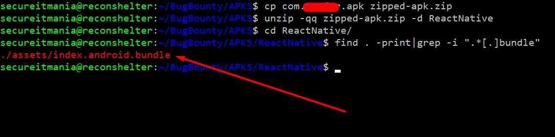 unzip -qq example-apk.zip -d ReactNativeBrowse to the newly created ReactNative folder, and find the assets folder. Inside this folder, it should contain index.android.bundle. This file will contain all of the React JavaScript in a minified format.React Native Reverse Engineering
