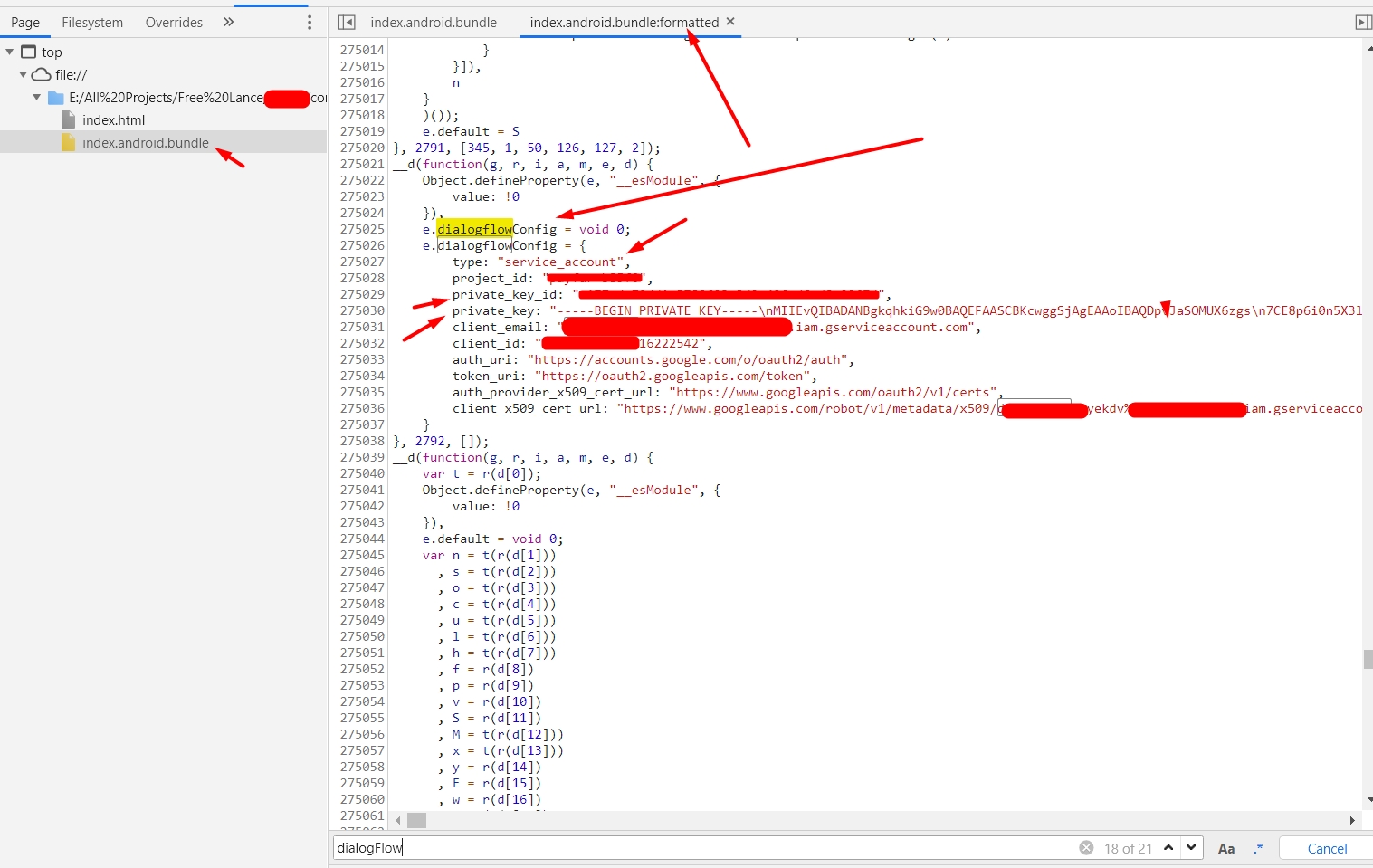 During my initial recon process, I have observed the application using the Dialogflow service. So based on this, I have searched a pattern related to its configuration. Fortunately, I was able to find sensitive hard-coded credentials in the Javascript code.