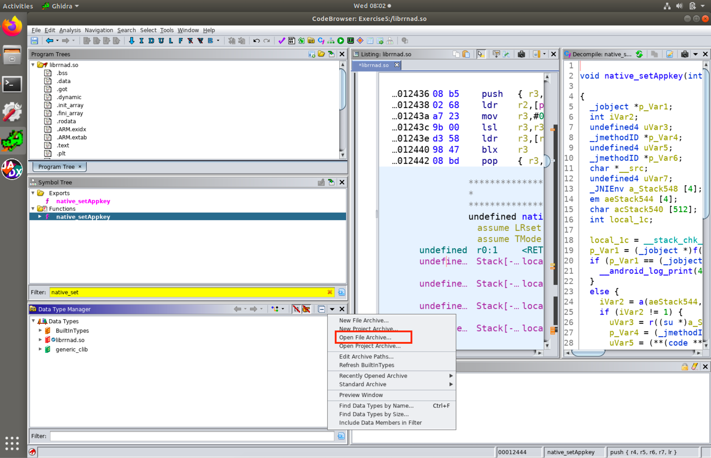 Thankfully, there’s a way to get the JNI function without doing all of this manually! In both the Ghidra and IDA Pro decompilers you can re-type the first argument in JNI functions to JNIEnv * type and it will automatically identify the JNI Functions being called. In IDA Pro, this work out of the box. In Ghidra, you have to load the JNI types (either the jni.h file or a Ghidra Data Types archive of the jni.h file) first. For ease, we will load the JNI types from the Ghidra Data Types archive (gdt) produced by Ayrx and available here. For ease, this file is available in the VM at ~/jni_all.gdt.