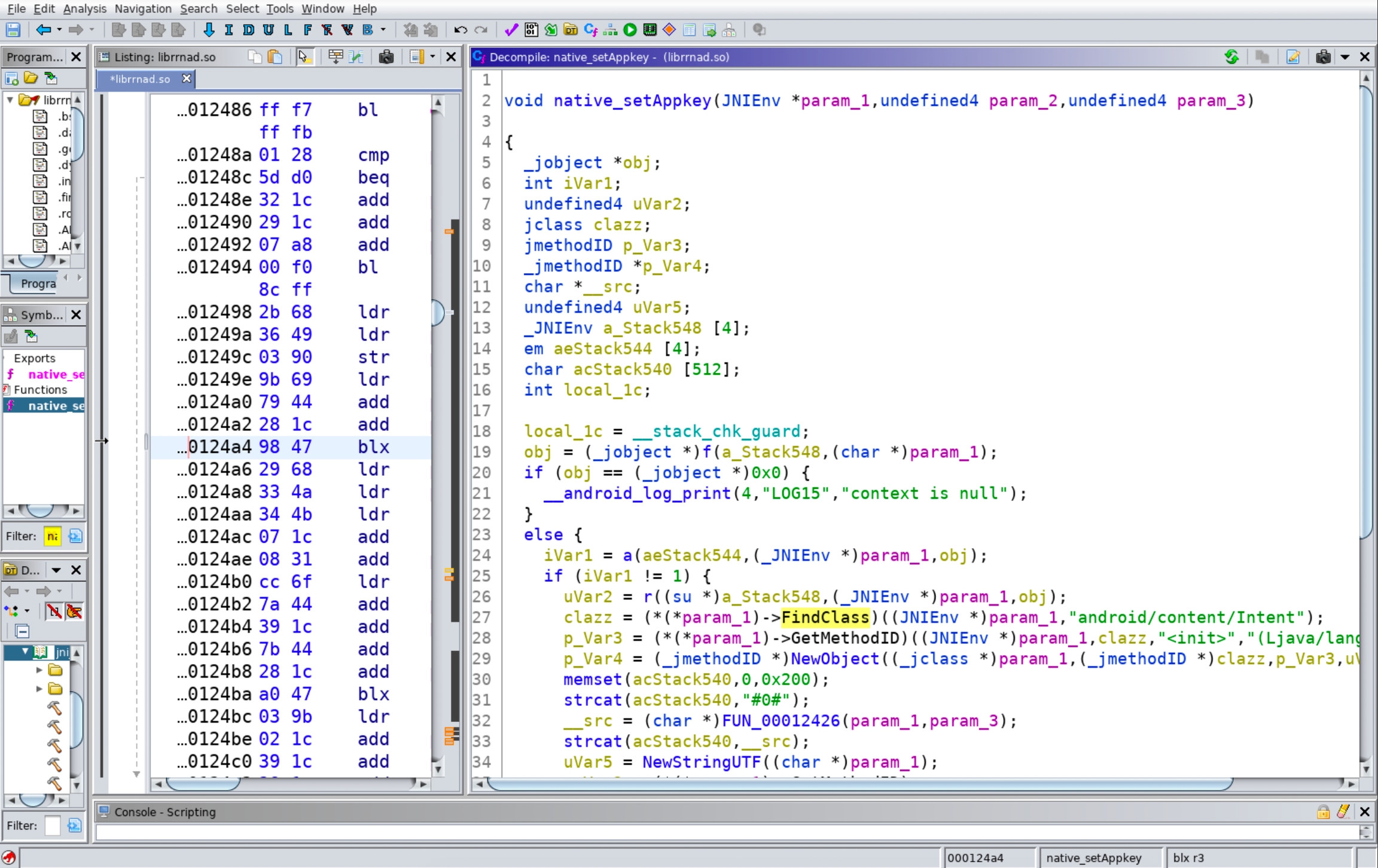 } JNINativeMethod;When reverse engineering, if the application is using the static linking method, we as analysts can find the JNINativeMethod struct that is being passed to RegisterNatives in order to determine which subroutine in the native library is executed when the Java-declared native method is called.
