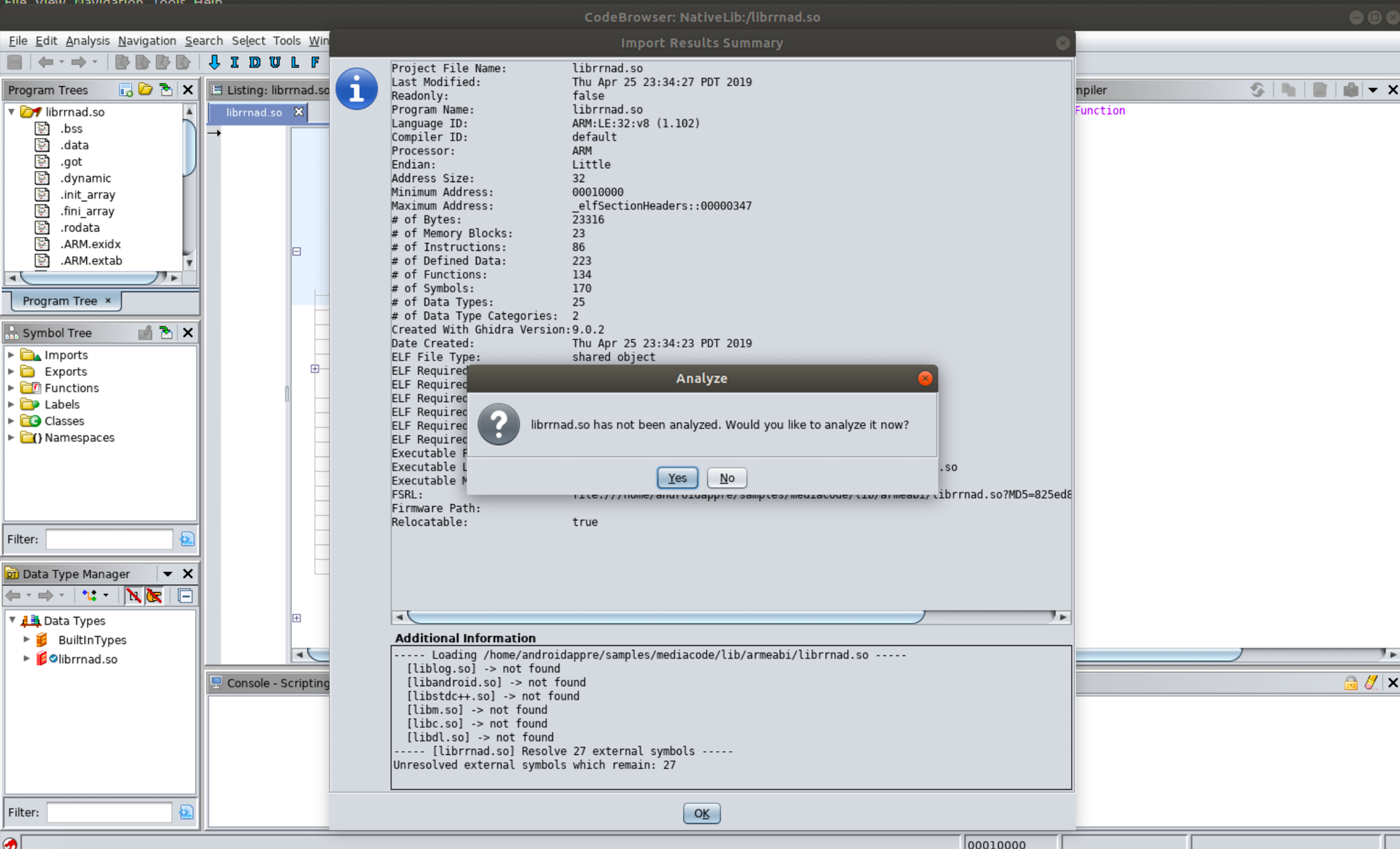 Once you’ve created your project, select the dragon icon to open the Code Browser. The go to “File” > “Import File” to load the native library into the tool. You can leave all defaults.