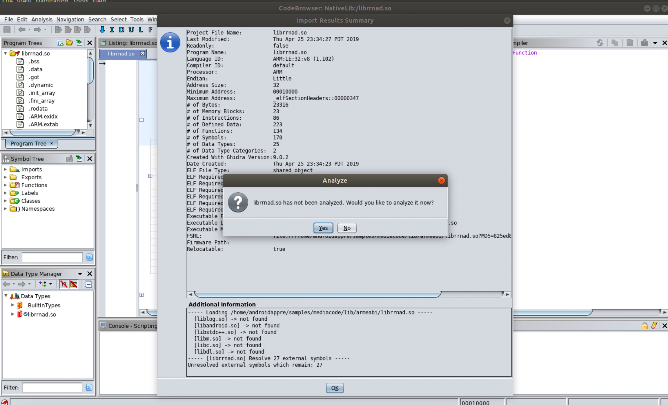 - Once you’ve created your project, select the dragon icon to open the Code Browser. The go to “File” > “Import File” to load the native library into the tool. You can leave all defaults.