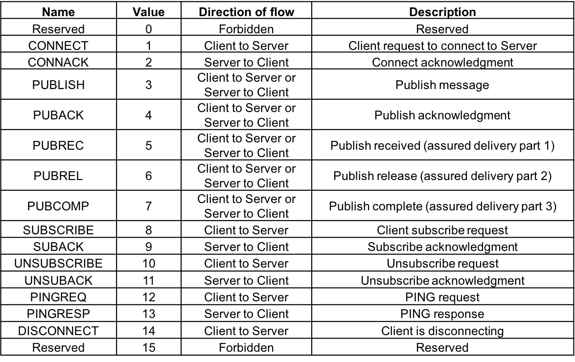 The first field of the fixed header represents the type of the MQTT Packet. All packet types are listed in table 01.Table 01: MQTT Packet Types
