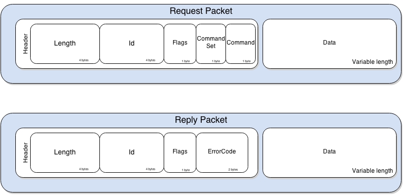 The Length and Id fields are rather self explanatory. The Flag field is only used to distinguish request packets from replies, a value of 0x80 indicating a reply packet. The CommandSet field defines the category of the Command as shown in the following table.