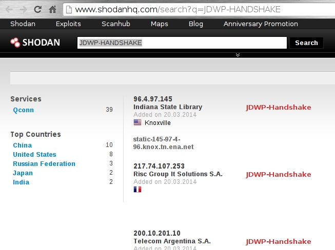 - At the time of writing this article, a quick search on ShodanHQ[4] immediately reveals about 40 servers sending the JDWP handshake: