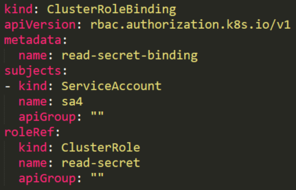 The purpose of this JSON file is to bind the admin “CluserRole” (line 11) to the compromised service account (line 16).