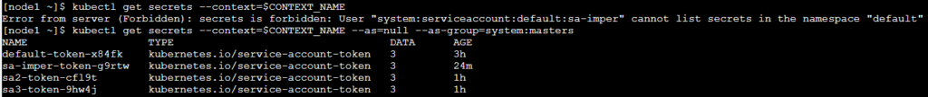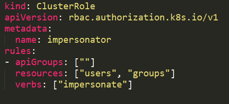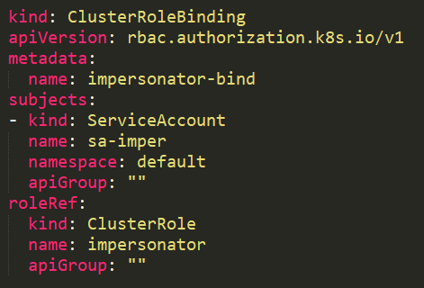 In this example, the service account sa-imper has a binding to a ClusterRole with rules that allow it to impersonate groups and users.