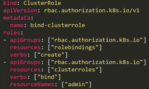 The following ClusterRole is using the special verb bind that allows a user to create a RoleBinding with admin ClusterRole (default high privileged role) and to add any user, including itself, to this admin ClusterRole.