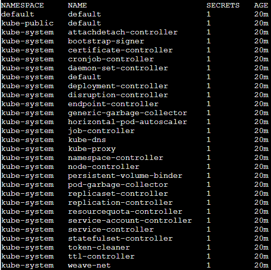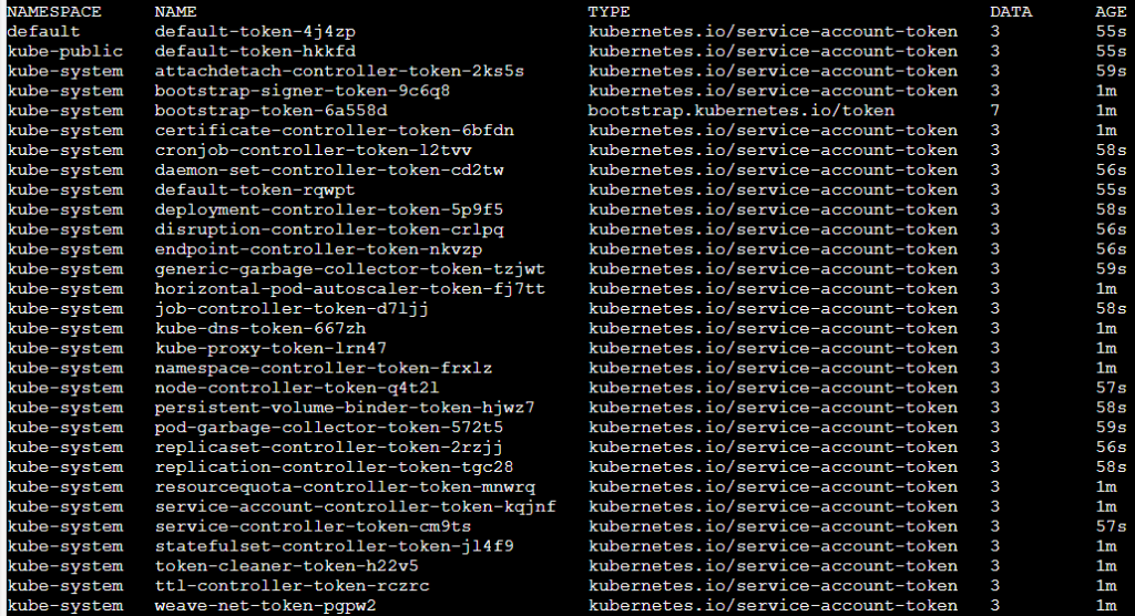 Each service account has an associated secret with a static (non-changing) prefix and a postfix of a random five-character string token at the end.