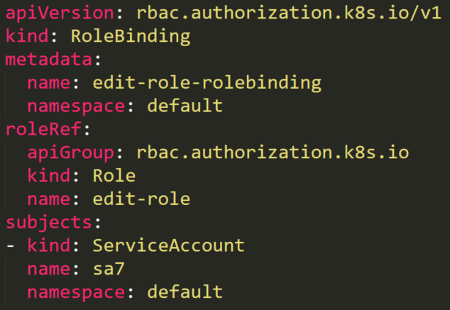 A service account named sa7 is in a RoleBinding edit-role-rolebinding. This RoleBinding object has a role named edit-role that has full permissions rules on roles. Theoretically, it means that the service account can edit any role in the default namespace.