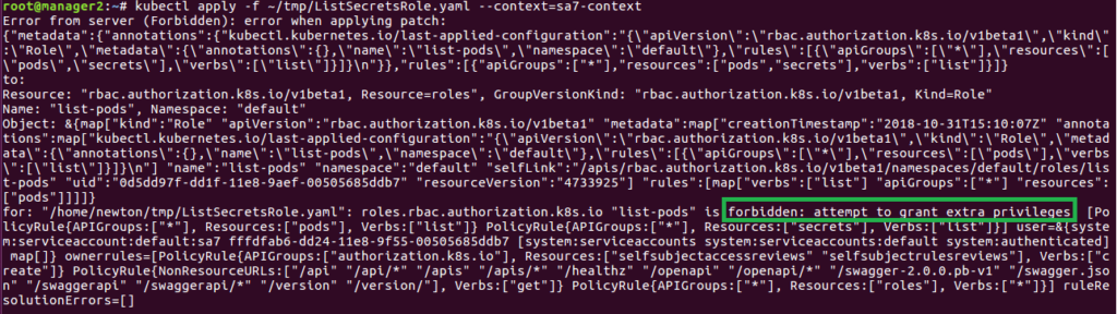 After trying to do so, we will receive an error “forbidden: attempt to grant extra privileges” (Figure 31), because although our sa7 user has permissions to update roles for any resource, it can update the role only for resources that it has permissions over.