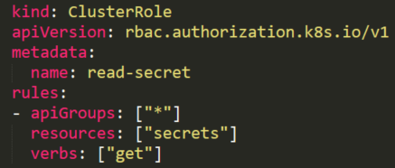 resources: ["*"] verbs: ["get"]- This privilege can be used to get secrets from other service accounts.