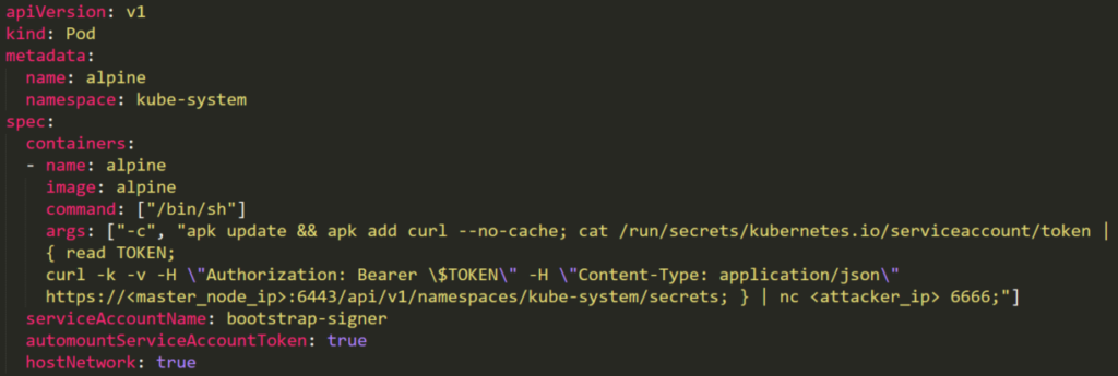 In line 6 you can find the object “spec” and children objects such as “template” in line 10. These objects hold the configuration for the task we wish to accomplish. Another thing to notice is the "serviceAccountName" in line 15 and the “containers” object in line 18. This is the part that relates to creating our malicious container.