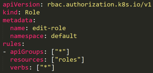 resources: ["*"] verbs: ["create"] – This privilege can create any resource in the cluster, such as pods, roles, etc. An attacker might abuse it to escalate privileges. An example of this can be found in the “Pods Creation” section.