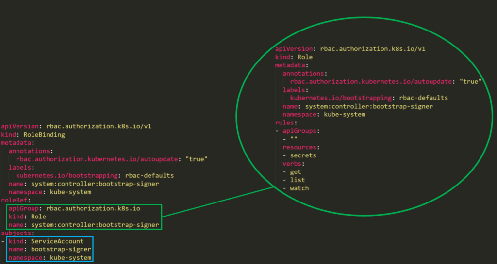 Here we have a default privileged account named bootstrap-signer with permissions to list all secrets.