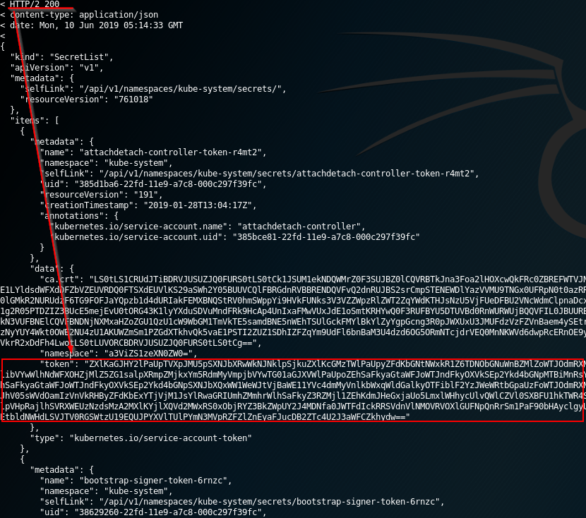 An attacker that gains access to list secrets **in the cluster can use the following curl commands to get all secrets in “kube-system” namespace: