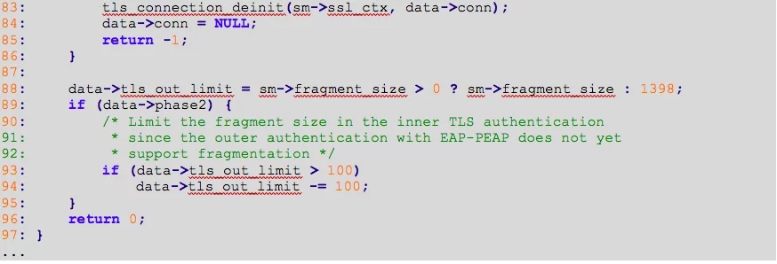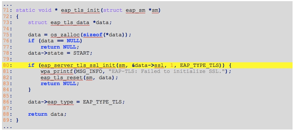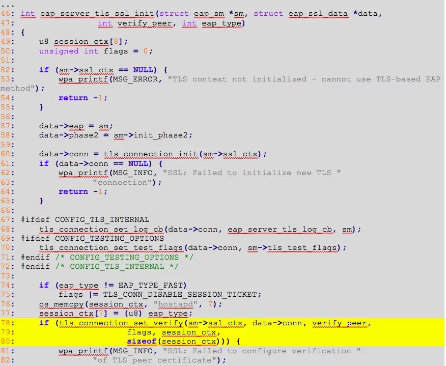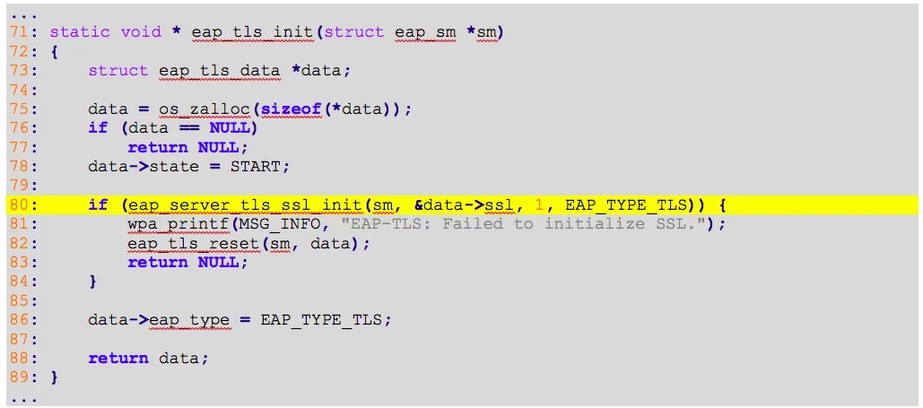 As you can see in the code above (line 80), the EAP TLS server implementation on hostapd invokes a custom function named eap_server_tls_ssl_init to initialize the server, and the third parameter is set to 1.