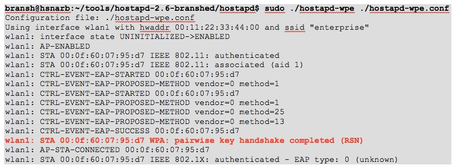 As a result, we will see on the modified hostapd-wpe tool’s output the following messages: