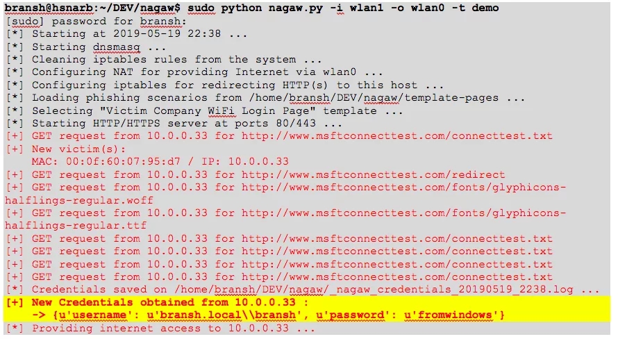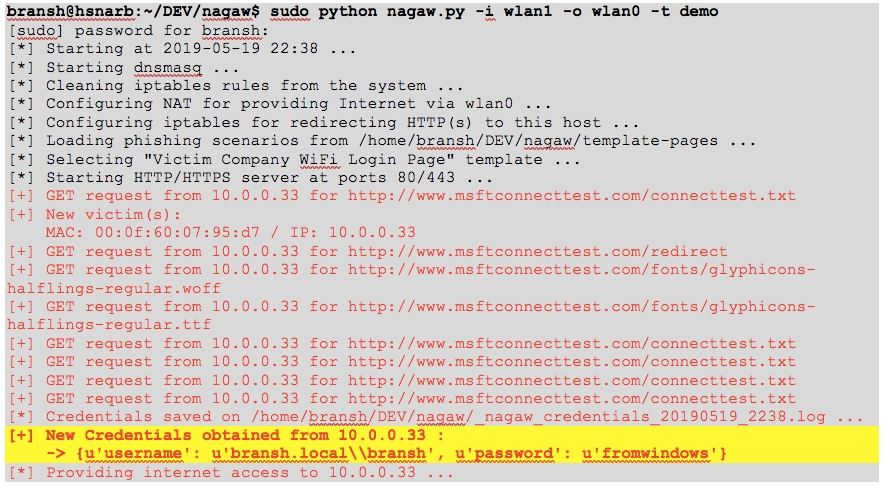 After the victim has entered her credentials, we can see the output on the captive portal’s console: